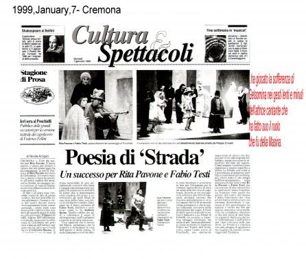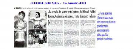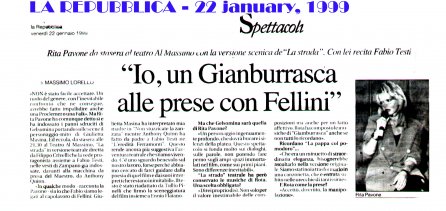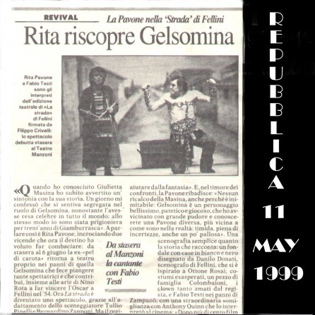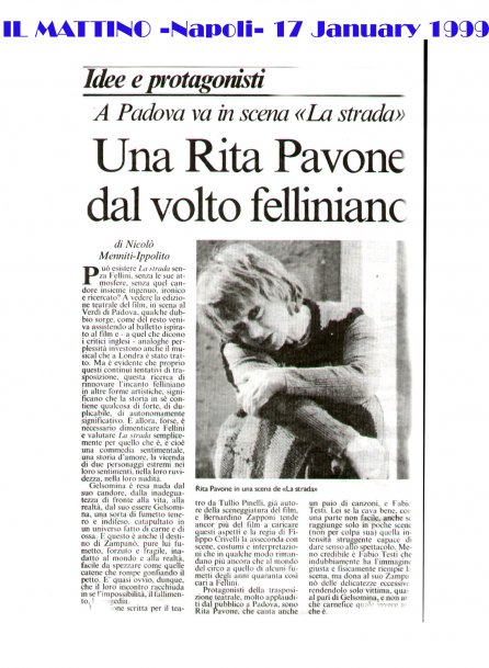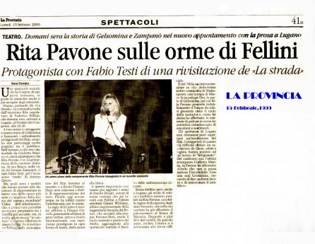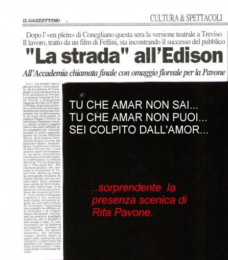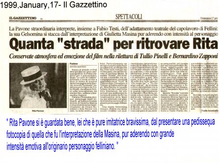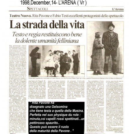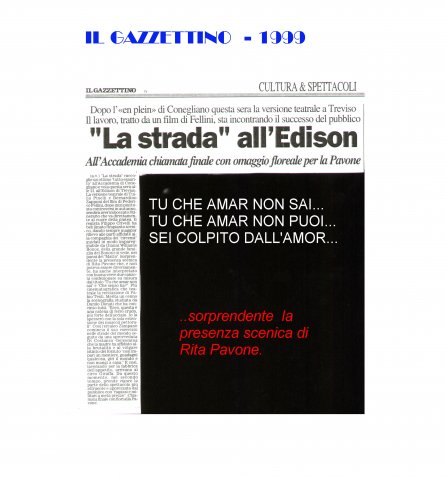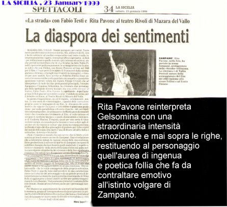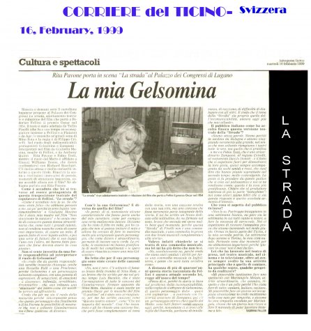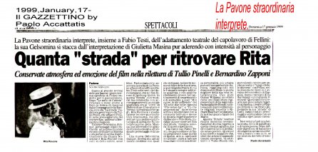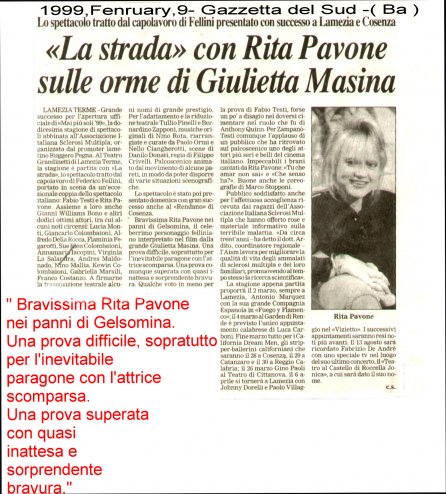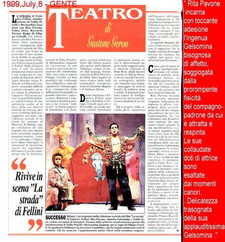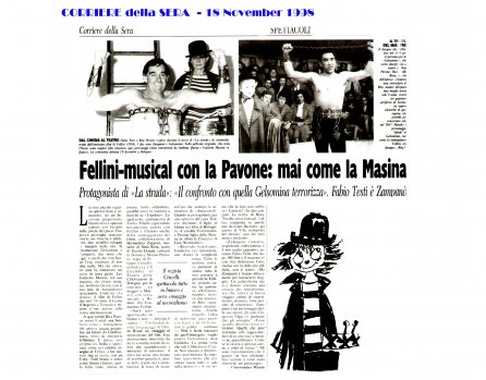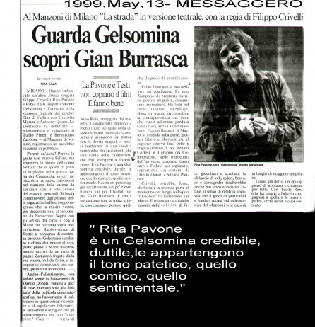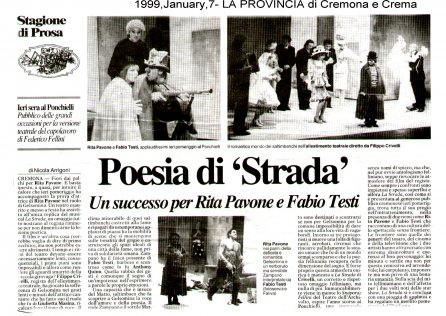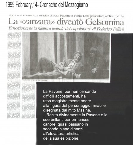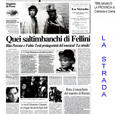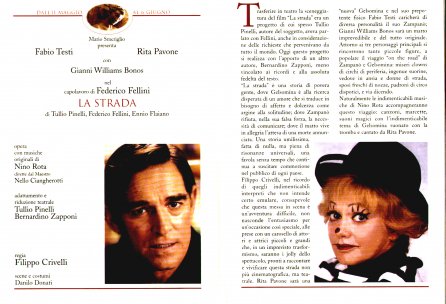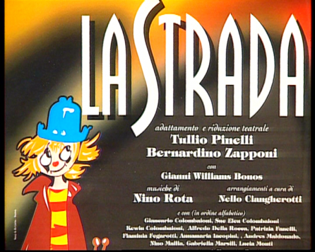 Rifacimento teatrale del grande successo cinematografico di Federico Fellini – premio Oscar 1954 quale miglior film straniero -, scritto dallo stesso Fellini e da Tullio Pinelli, che portò a far conoscere,a livello mondiale, il talento di tre incommensurabili attori quali, Giulietta Masina , Anthony Quinn e Richard Basehart ; la commovente colonna sonora con il tema di “ Gelsomina “ del grande Nino Rota, e le scene e i costumi di Danilo Donati.