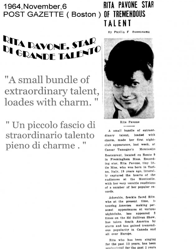 1964, 6 November- " Rita Pavone Star of tremendous talent " - Post Gazette- Boston - USA