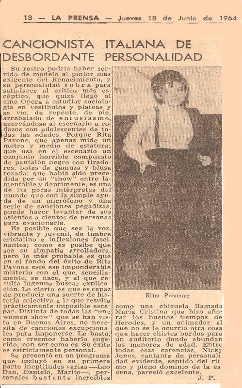 Il suo viso potrebbe essere servito da modello al pittore più esigente del Rinascimento, e la sua personalità è tale da soddisfare il critico più scettico, il quale forse, andò al Cinema Opera per studiare sociologia nei camerini e in platea, e si vide, di colpo, esaltato dall'entusiasmo,raggiungere il palcoscenico in coda con adolescenti di tutte le età. Perchè Rita Pavone, che misura appena un metro e mezzo di altezza; che usa in scena una mise orrenda composta da pantaloni neri con bretelle, stivali in camoscio e una camicia rosa, è una delle poche interpreti del mondo che, con il semplice aiuto di un microfono e una serie di canzoni contagiose, riesce a far alzare centinaia de persone dalle loro sedie per applaudirla. E' possibile che sia la voce, vibrante e giovanile, dal timbro cristallino e dalle inflessioni affascinanti; com'è possibile che sia la sua simpatia travolgente, però, la cosa più probabile è che nel fondo del successo di Rita Pavone ci sia un imponderabile mistero con il quale semplicemente si nasce, e del quale sarebbe ingenuo cercarne le spiegazioni. Certamente è che questo è capace di produrre una sorta di isterismo collettivo dal quale sembra essere impossibile sfuggire. Diversa da tutte le " one woman show " che si sono viste a Buenos Aires, non ha bisogno di canzoni eccezionali per imporsi. Le basta, come crediamo di averlo suggerito, l'essere così com'è. Il suo successo è rigorosamente personale.