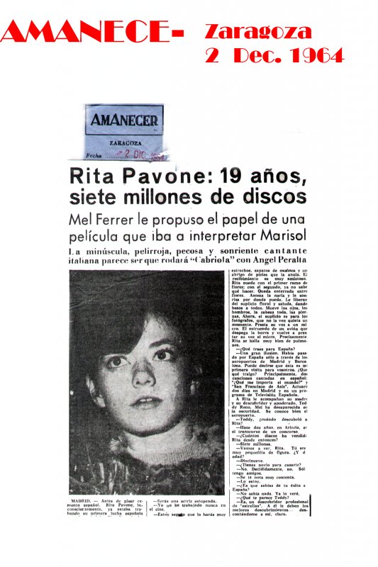 1964 , 2 Dicember - " 19 anos, siete miliones di discos " ( 19 years-old, seven millions record sold )- AMANACER - Spain