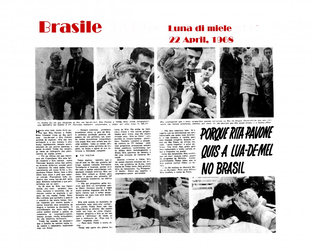 C'era una ragione molto forte perchè Rita Pavone e Teddy Reno scegliessero Rio per la loro luna di miele e ce ne hanno spiegato la ragione. Rita non parla portoghese e il suo italiano, piuttosto veloce, è sempre accompagnato da un sorriso amichevole e quasi innocente. Teddy,si fa pertanto da sempre interprete dei sentimenti della giovane sposa.