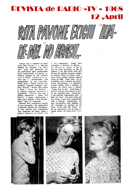 1968, 12 April - " Rita Pavone exigiu " Lua - de - mel " do Brasil " ( )- REVISTA DE RADIO - Brazil