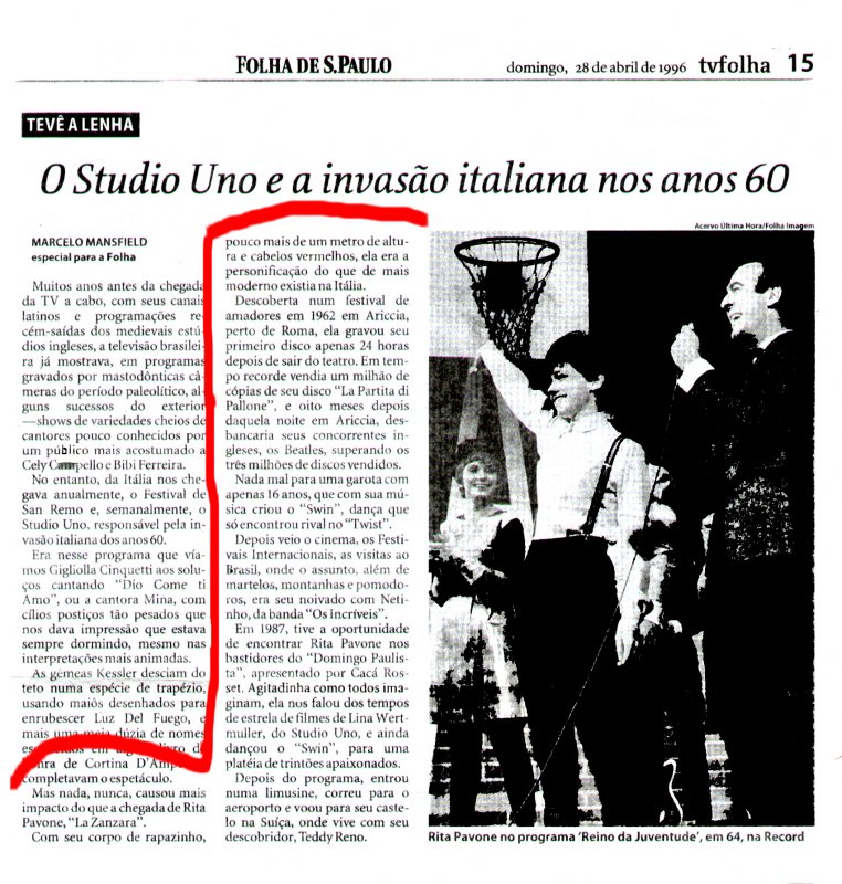 Nel 1987 ebbi l’opportunità di incontrare Rita Pavone nel backstage degli studi di “ Domingo Paulista “ presentato da Cacá Rosselli. Sempre in movimento come tutti se la immaginano, lei ha raccontato del periodo in cui era la star indiscussa dei film di Lina Wertmüller e di Studio Uno, ed inoltre ha ballato lo “ Swim “ per una platea di appassionati trentenni .