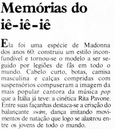 Ha costruito uno stile ed è diventata un modello seguito da milioni di fans in tutto il mondo. Capelli corti, stivaletti, camicia di taglio maschile e pantaloni neri aderenti con le bretelle, compongono l'immagine della più popolare cantante di musica pop che l'Italia abbia avuto. La cinètica RITA PAVONE.