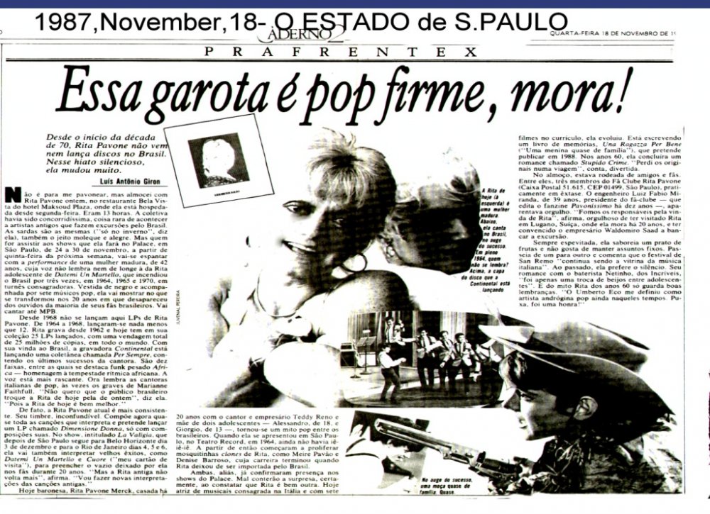 Entrambe, del resto, hanno già confermato la loro presenza negli shows al Palace, ma state pur certi che avranno una brutta sorpresa nel constatare che Rita è un’altra . Oggi, consacrata attrice di musicals in Italia e con sette film nel suo curriculum, lei si è artisticamente evoluta. Sta scrivendo un libro di memorie,” Una Ragazza quasi perbene “( Uma menina quase de família “ ), che intende pubblicare nel 1988.