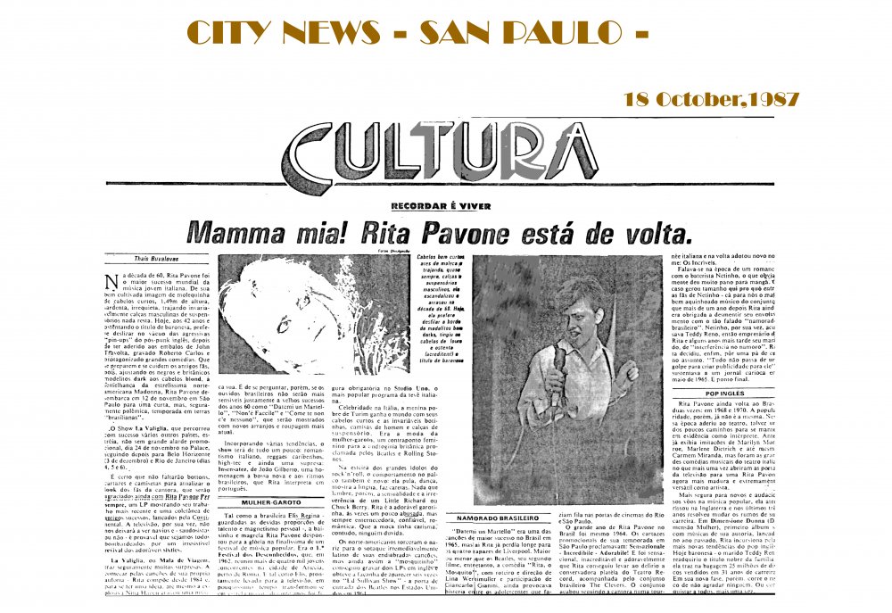 1987- 10 Ottobre- " Mamma mia ! Rita Pavone està de volta ! " ? Mamma mia ! Ritorna Rita Pavone ! )- pagina della Cultura - CITY NEWS SAN PAULO- Brasile