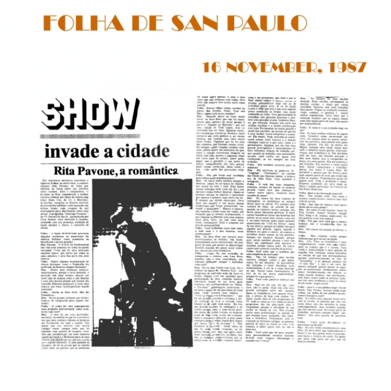 1987- 16 Novembre - Invade a cidade, Rita Pavone, a romantica " ( Invade la citta, la romantica Rita Pavone ) FOLHA DE SAN PAULO- Brasile