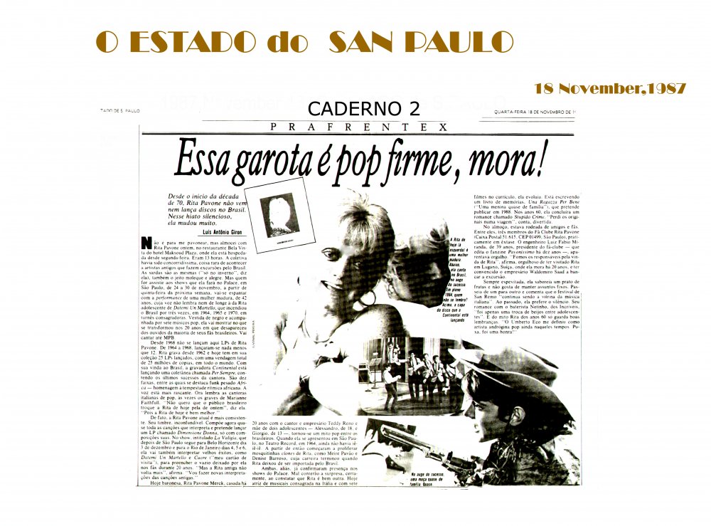 1987- 18 Novembre - " Esta garota é Pop firme , mora ! " ( Caspita! Questa ragazza e decisamente pop ! )O ESTADO DE SAN PAULO- Brasile