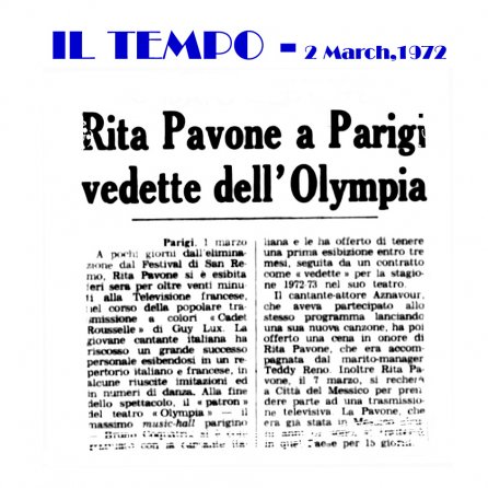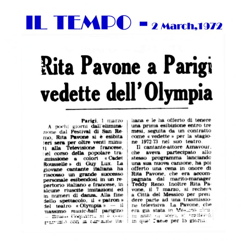 1972- 2 Maggio - " Rita Pavone a Parigi vedette dell'Olympia "- IL TEMPO